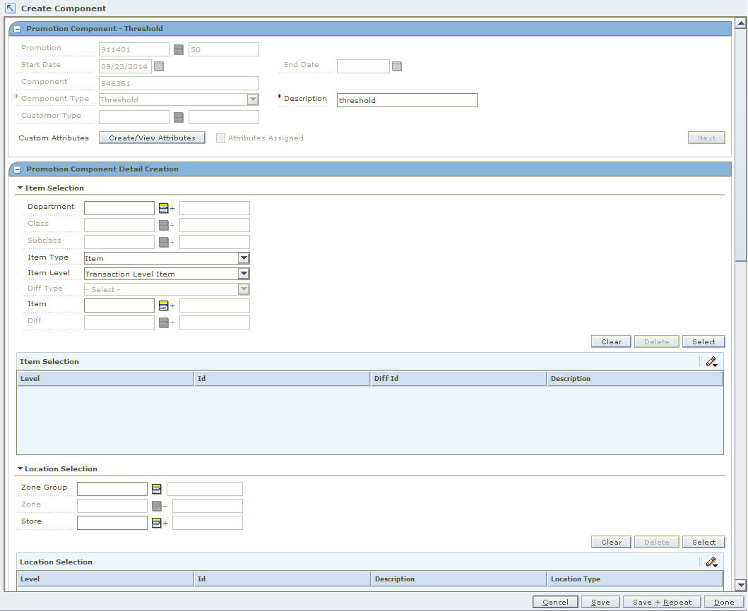 Threshold Component - A threshold promotion component consists of an item, item group, or merchandise level that receives a discount at a location or group of locations when the customer purchases a quantity or a amount of an item. You must define the threshold levels before you can create the threshold component.