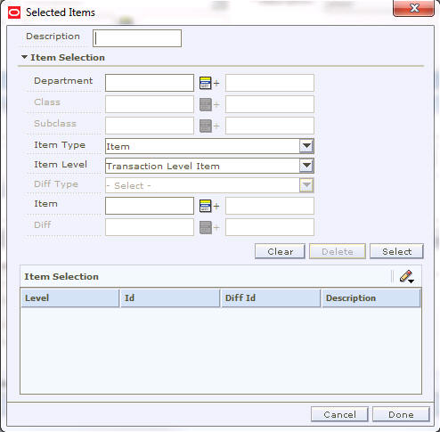 You can select and filter items based on the way your promotion was created. If created at Department level, you can select parent items, parent item diff, or transaction level items. If your promotion was created at parent level you must select items at transaction item level.