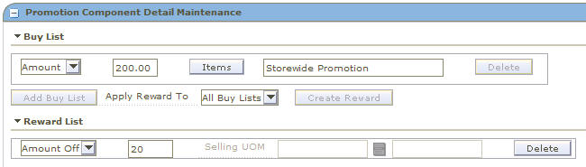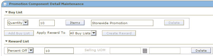 Transaction Component - A transaction promotion component will have a discount type of dollar off or percent off that will be taken off the entire purchase (shopping basket) versus specific items in a transaction. This promotion has the same look and feel as setting up a multi-buy promotion; the main difference is that the reward given to the customer is a discount on their entire purchase amount. This type of promotion can be set up at storewide level or by designating specific items to purchase to receive the discount. See "Examples of Transaction Components" for more detailed examples.