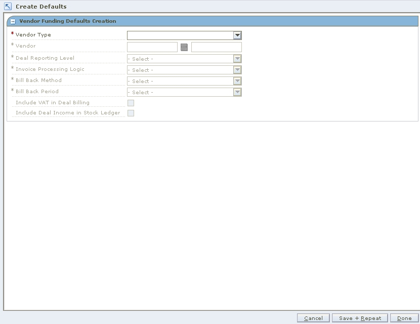 Navigate: From the Task Pad, select Vendor Funding Defaults > Create Defaults. The Create Defaults workspace opens.