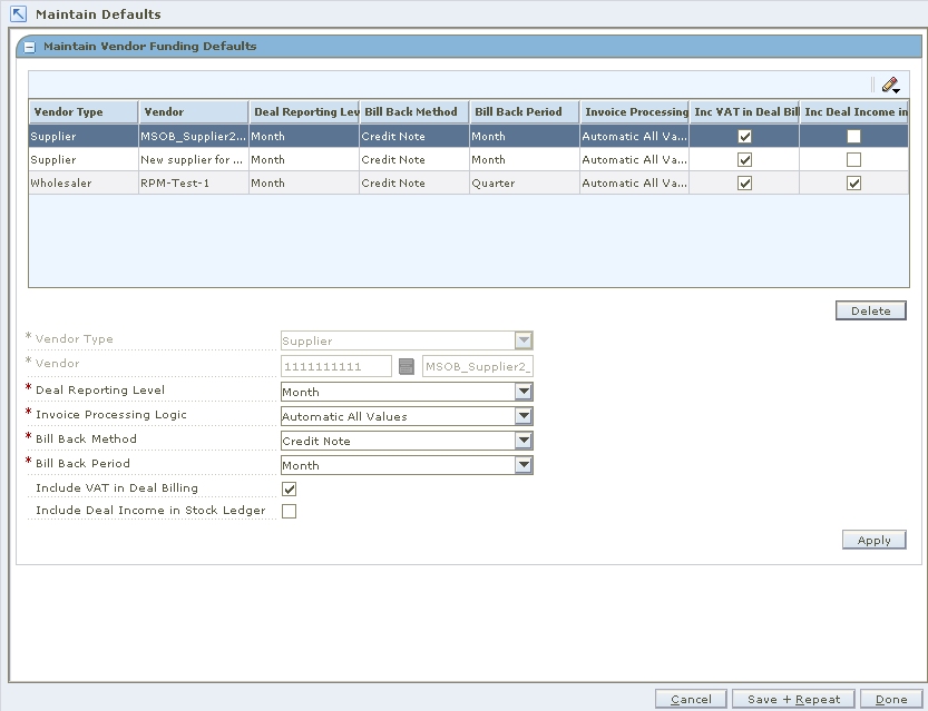 Navigate: From the Task Pad, select Vendor Funding Defaults > Maintain Defaults. The Maintain Defaults workspace opens.