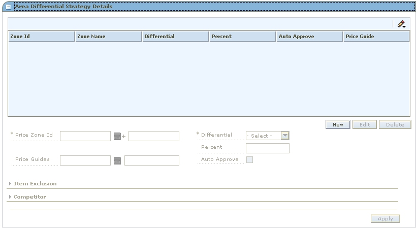 Zone - Enter the ID of the zone to add to the area differential price strategy, or click the LOV and select a zone.