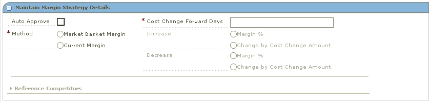 The maintain margin pricing strategy allows you to define the pricing strategy for items based on future cost changes. The proposed retails can be based on current or market basket margin percentages. Reference competitors may be assigned for comparison purposes.