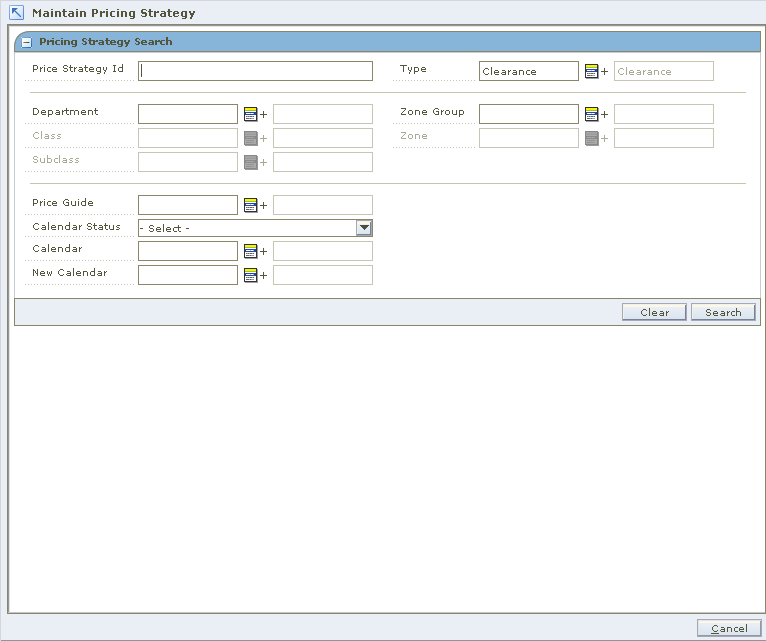 Navigate: From the Task Pad, select Price Strategy > Maintain Price Strategy. The Pricing Strategy Search workspace opens.