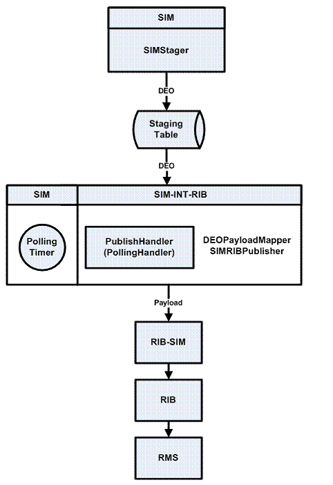 Oracle Retail Stores Inventory Management publishes messages (payload) to RIB JMS through the RIB-SIM component, and RIB Binding subsystem converts the payload object into an XML string. The object on the Binding subsystem is put into a RIB envelope called RibMessage. The data within RibMessage eventually becomes a message on the RIB. A Publisher class in the Binding subsystem is called to write the data to the RIB’s JMS queue. On a regular basis, the RIB engages in polling the JMS queue, searching for the existence of a message. A publishable message that appears on the JMS queue is processed.