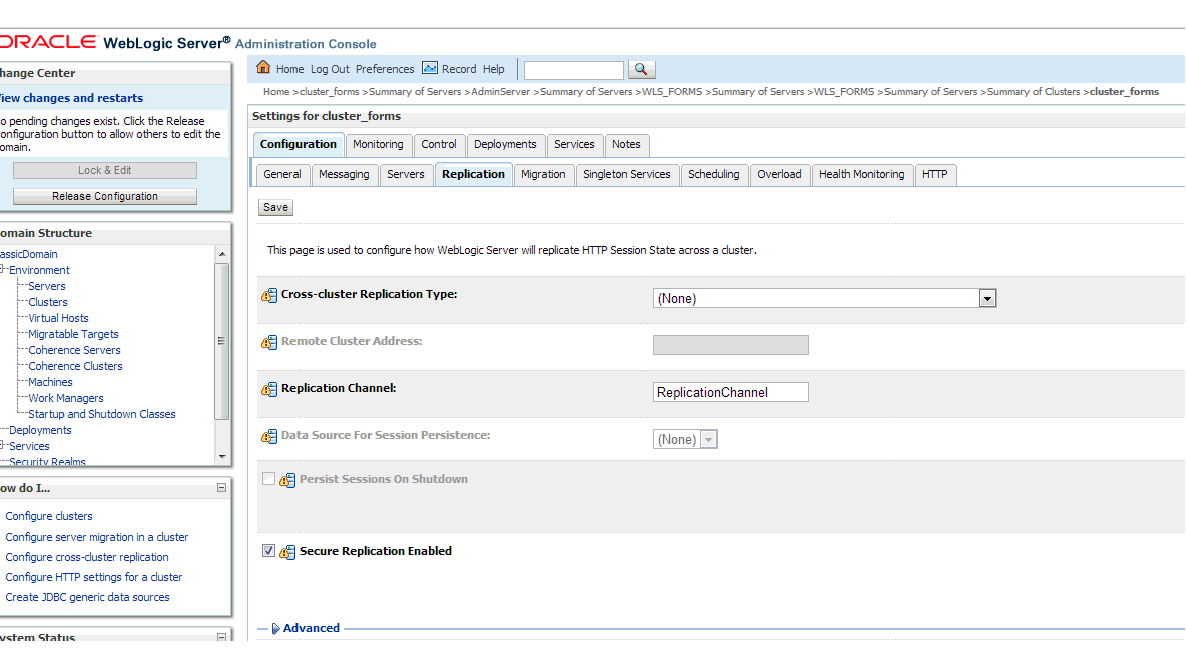 Log in to WebLogic Console. Select Environment > Clusters > cluster_forms, then select Configuration > Replication.