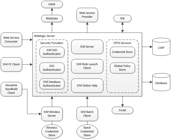In order for a remote client to connect to the SIM application, user authentication is required. SIM supports authentication for SSO, LDAP, and database security. This is handled by WebLogic security authentication providers.