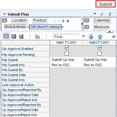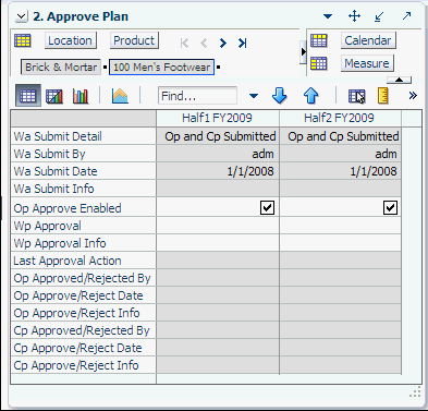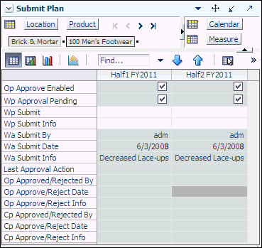 As a result of running the Submit custom menu, the Wp Submit and Wp Submit Info measures are cleared and the Wp Approval Pending check boxes are checked. The Wa Submit By, Wa Submit Date, and Wa Submit Info measures are populated with the new submit information. In addition, your working plan is copied into a Waiting for Approval (Wa) plan.