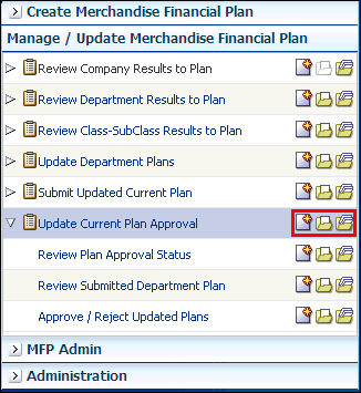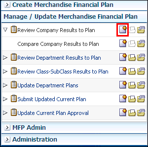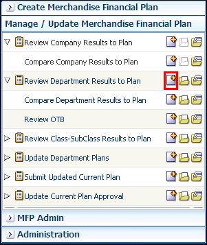 All users—top down, middle out, and bottom up—can use the Manage/Update Merchandise Financial Plan activity during in-season to review the plan and compare it to the season actuals. Top down and middle out users review their targets and the plans created by the lower level users and determine how those plans compare to actuals. Bottom up users can not only review their plan to actuals, but also adjust their plan with the Update Department Plans task.