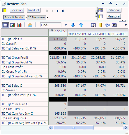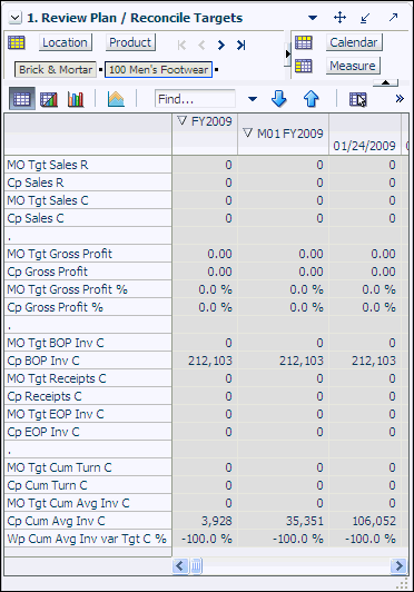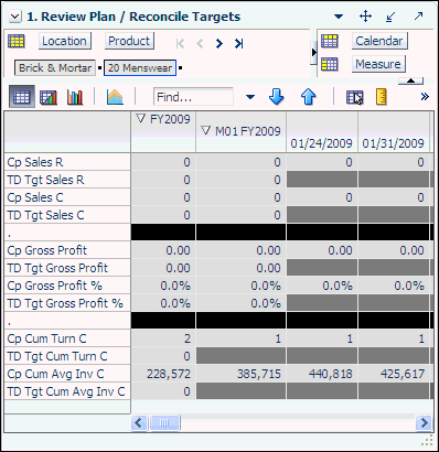 The Review Plan /Reconcile Targets view allows you to compare your plan to the current or original plan and reconcile your targets to the top down targets. Use the four measure profiles in this view to perform these tasks: