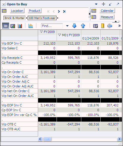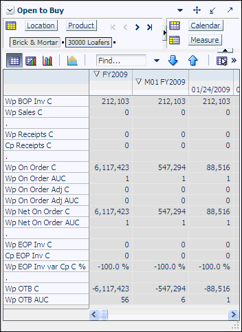 The Open to Buy view enables you to understand the variance between the current planned receipt cost to the on order cost and any on order adjustment cost. This variance is shown in the Wp OTB C and Wp Reference OTB AUC measures. These measures show the user how much additional receipts can be purchased as well as what AUC to purchase these at for the current approve receipt retail and profit plan. Users should understand if their planned receipts keep them on overall Cp EOP inventory plan. To understand the variance between the Cp EOP inventory plan and the Wp EOP inventory plan, users can reference the measure Wp EOP Inv var Cp C%.