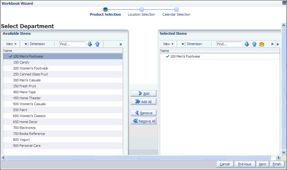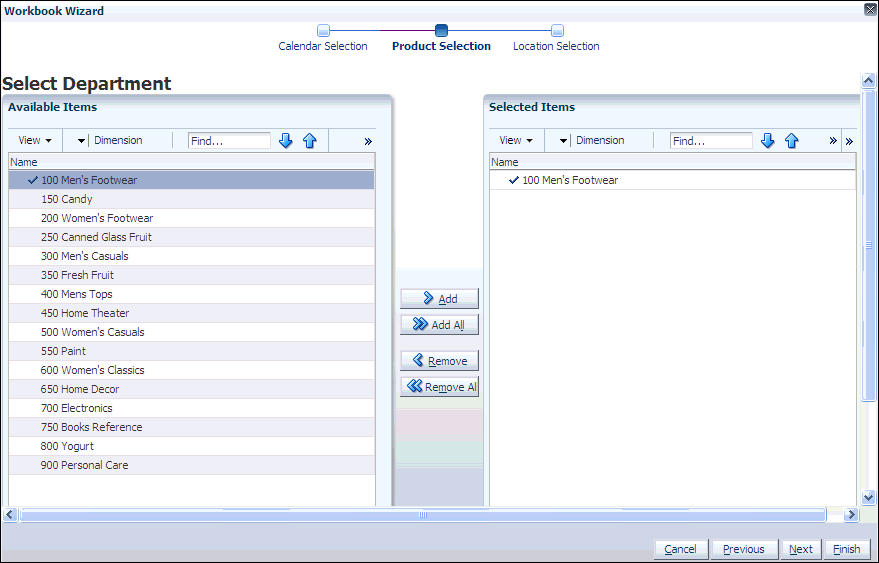 The workbook wizard opens at the Product Selection step. Select the departments that you want to plan and move them to the Selected Items box. Click Next.