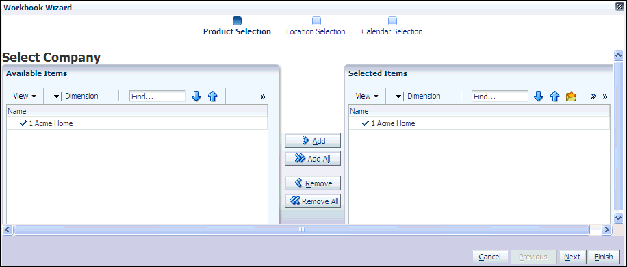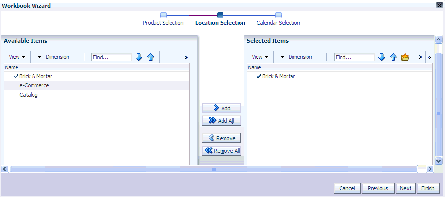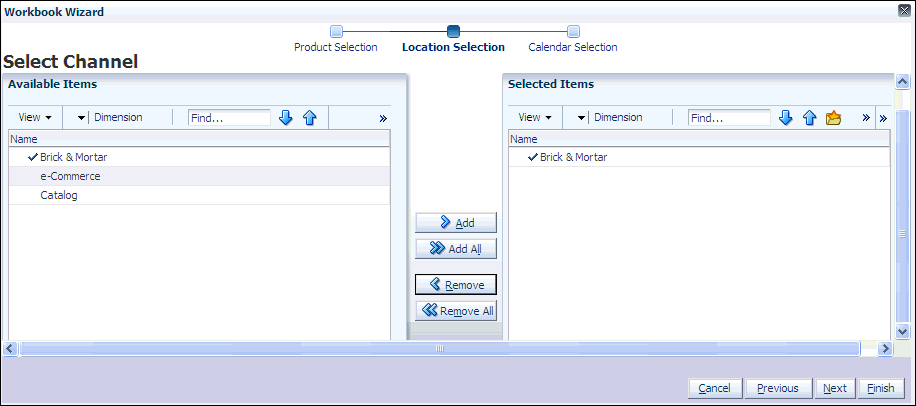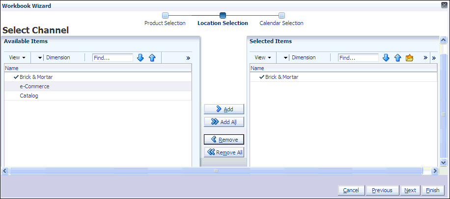 The Location Selection step of the workbook wizard appears. Select the channel you want to plan and move it to the Selected Items box. Click Next.