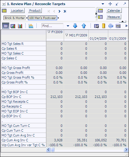 The Review Plan /Reconcile to Targets view allows you to compare your plan to the current or original plan and reconcile your targets to the middle out targets. Use the four measure profiles in this view to perform these tasks: