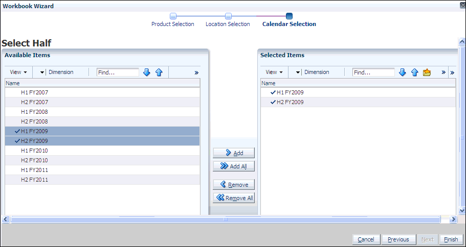 The Calendar Selection step of the workbook wizard appears. Select the halves you want to plan and move them to the Selected Items box. Click Finish.