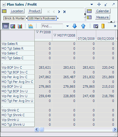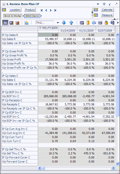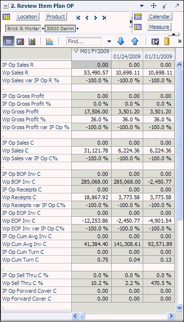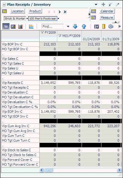 Like the Plan Sales/Profit view, the Plan Receipts / Inventory view contains several Ly metrics that you can reference when setting your targets. There are also additional measures for adjusting your inventory targets. Note that the adjustments you made to the Wp Sales R measure in the Plan Sales and Profit view are visible in this view if you have calculated.