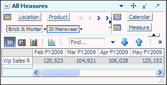 The All Measures view contains all the measures contained in the workbook; however, only the Wp Sales R measure is visible in the default measure profile. The purpose of this workbook is to allow you to create a view of workbook measures that you may not be able to view all at once in other views.