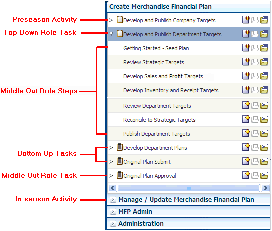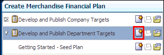When middle out users open MFP in the RPAS Fusion Client, they are presented with the preseason activity called Create Merchandise Financial Plan. Within this activity, the middle out user owns two tasks. The first task in the list that belongs solely to middle out users is Develop and Publish Department Targets. It has seven steps: