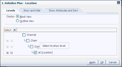 The dimension window appears. Select the level of the dimension that you want to appear in the page edge. If you want to view more than one level at a time in the page edge or grid, select multiple levels. In Figure 4-11, Channel was deselected and all [Location] was selected instead.