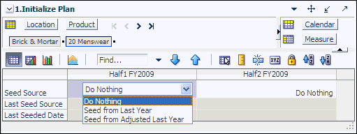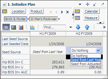 The seed source used to seed the working plan. Use this option to seed or not seed the working plan. You can seed with Last Year's (Ly) or Adjusted Last Year's data. Or, you can choose the Do Nothing option if you do not want to seed the working plan. |