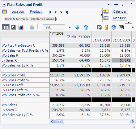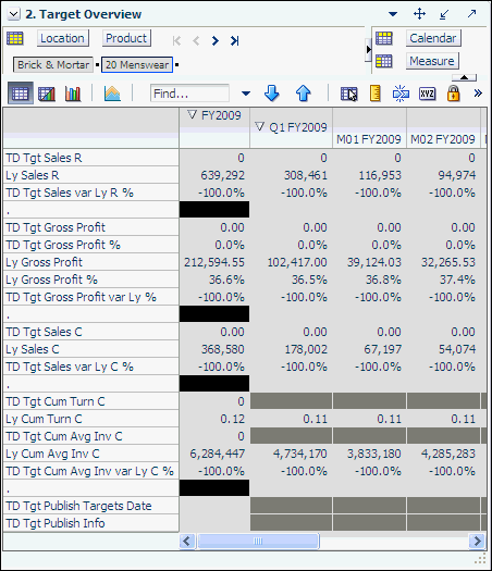Note: The top down targets are at the group level, but the view is at the department level. To see the targets, change the level of the Product dimension from department to group. To see the TD Tgt Publish Date and Info measures, change the level to division and include year in the Calendar dimension. |