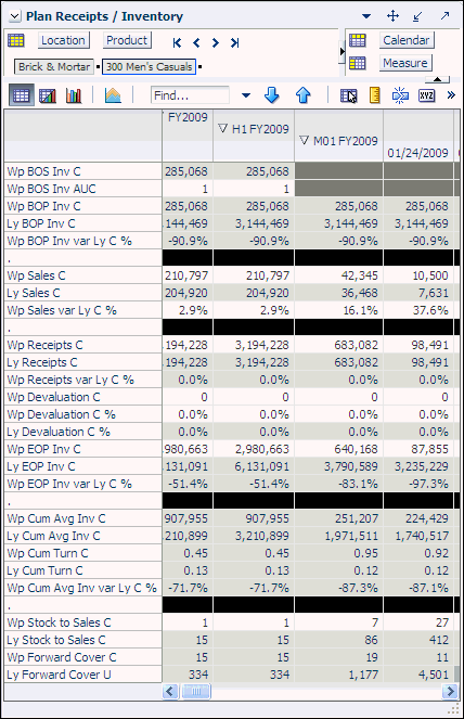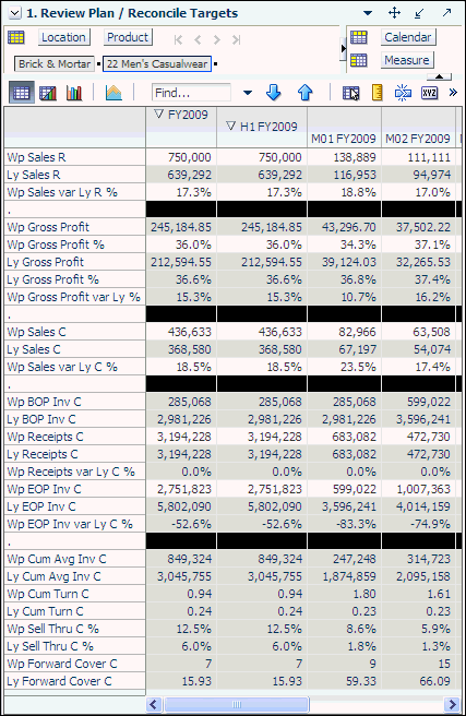 Like the Plan Sales and Profit View, the Plan Receipts / Inventory view contains several Ly metrics that you can reference when setting your targets. There are also additional measures you can use to adjust your inventory targets. Note that the adjustments you made to the Wp Sales R measure in the Plan Sales and Profit View are visible in this view if you have calculated.