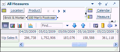 The All Measures view contains all the measures contained in the workbook; however, only the Wp Sales R measure is visible in the default measure profile. The purpose of this view is to allow you to create a view of workbook measures that you may not be able to view all at once in other views.
