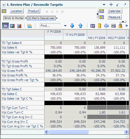 Use the Reconcile to TD Targets measure profile to reconcile your plan to the top down targets. When using this profile, set the calendar dimension to month and product to group. This measure profile includes your working plan (Wp) measures that as well as the top down target (TD Tgt) measures.