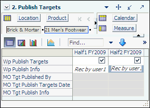 Use the Publish Department Targets step when you are ready to publish the targets you created. Publishing targets copies the target information to the middle out target (MO Tgt) measures in your workbook, and then copies them to the database. After you have published the targets to the domain, the targets are passed down to the bottom up user.