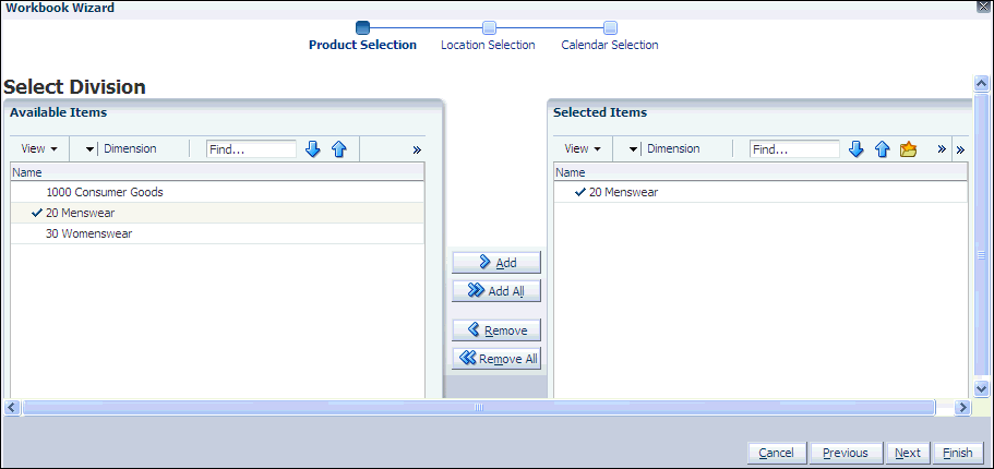 The workbook wizard opens at the Product Selection step. Select the divisions that you want to plan and move them to the Selected Items box. Click Next.