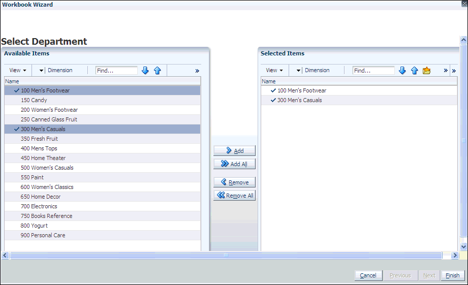 The workbook wizard opens at the Product Selection step. Select the departments you want to see and click Finish.