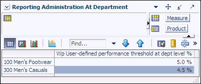 Use this view to define a threshold between the actual sales and the planned sales for each department. This threshold is used to highlight sales data in the Oracle BI EE reports. Sales that fall below the threshold appear in red. Sales above the threshold appear in green.
