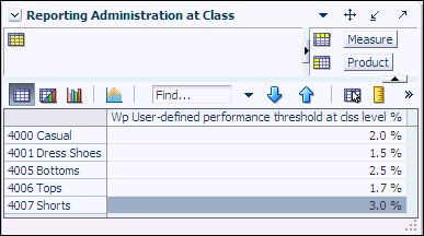 Use this view to define a threshold between the actual sales and the planned sales for each class. This threshold is used to highlight sales data in the Oracle BI EE reports. Sales that fall below the threshold appear in red. Sales above the threshold appear in green.