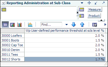 Use this view to define a threshold between the actual sales and the planned sales for each subclass. This threshold is used to highlight sales data in the Oracle BI EE reports. Sales that fall below the threshold appear in red. Sales above the threshold appear in green.