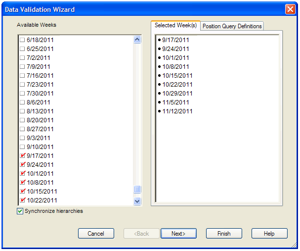 The Data Validation Wizard appears at the Select Calendar step. Select the weeks you want to validate and click Next.