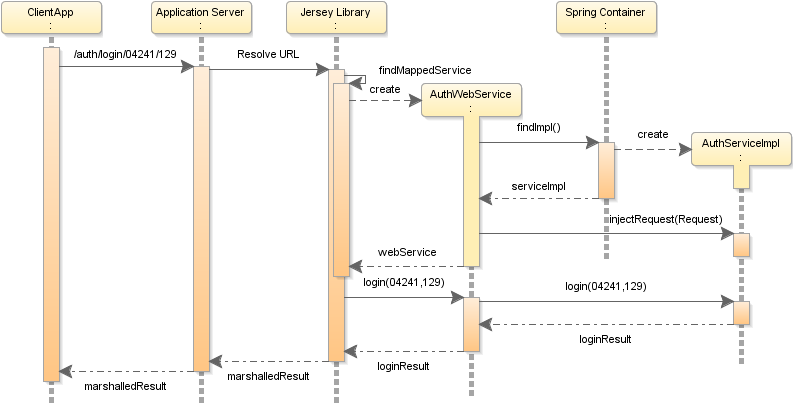 When the client application calls a service API, the Jersey library's registered servlet intercepts the call and directs it to the API mapped to the URL requested, extracting parameters where necessary. Once the class and method are identified, the Jersey library instantiates the class and injects the request information into the new instance. The constructors of the provided REST classes look up their paired implementation class from the Spring container and inject the provided request context into them, provided they implement the ContextAwareServiceIfc.