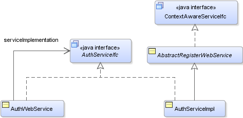 The REST service layer is composed of a REST-annotated shell class backed by a service implementation class. Each service class follows the same pattern, as seen in the AuthWebService example in Figure 4-1.