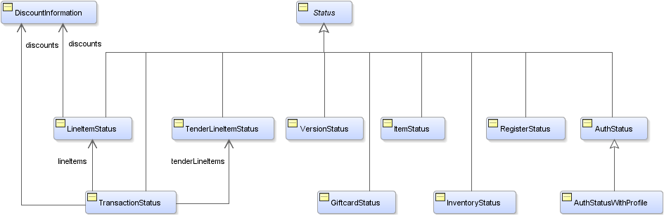 The Status base class provides an error collection that allows the API to return error codes and messages to the calling application. Each Status sub-class represents the state of a particular retail object: Register, Item, Transaction, and so on.