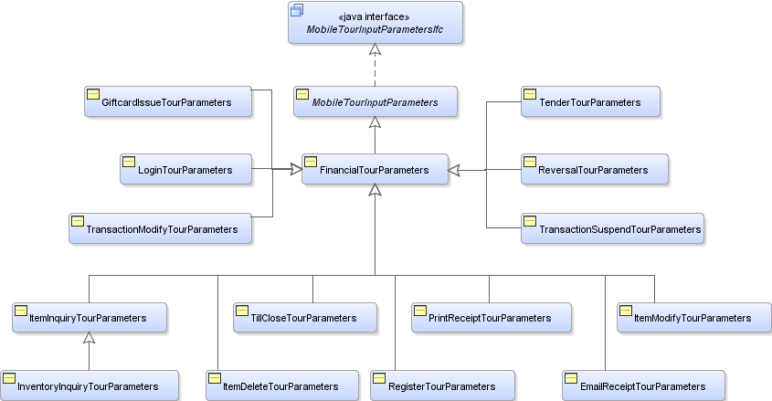 The inputs to the service API are collected into various tour parameter objects and passed into the tour associated with mapped tour runner. The API instantiates these classes using the MobilePOSObjectFactoryIfc. This allows the objects to be extended and customized in a manner similar to POS domain objects.