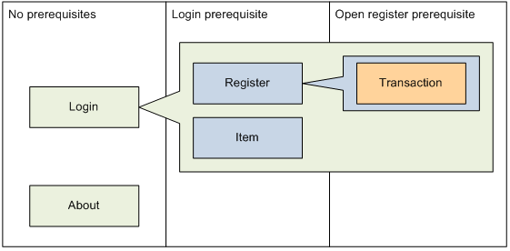 These dependencies follow the service area boundaries closely. The Login and About service areas have no prerequisites. Their APIs can be called at any time. The Register and Item service areas require that the login API be called before accessing their APIs. And finally, the Transaction service APIs require that the open register API be called before trying to work with transactions.