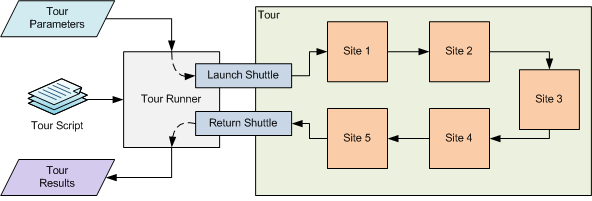 Each service API method runs a configured tour script and retrieves the tour results through configured shuttles. Input parameters for the service are packaged up into Tour Parameters and passed into the Tour Runner.