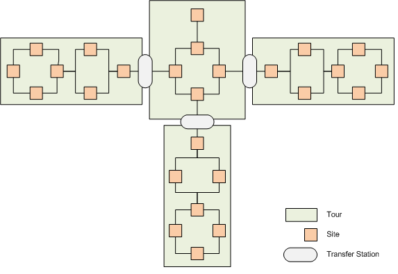 The services use a mobile POS tier and the TourRunnerIfc to access POS tour code. A traditional POS tour map is a single connected graph of sites, organized into tours connected by transfer stations. See Figure 3-2.