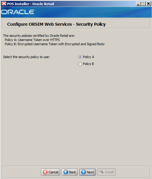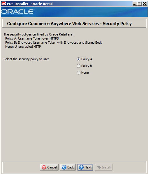 This window is displayed if Policy B is selected in the Configure Commerce Anywhere Web Services - Security Policy window.