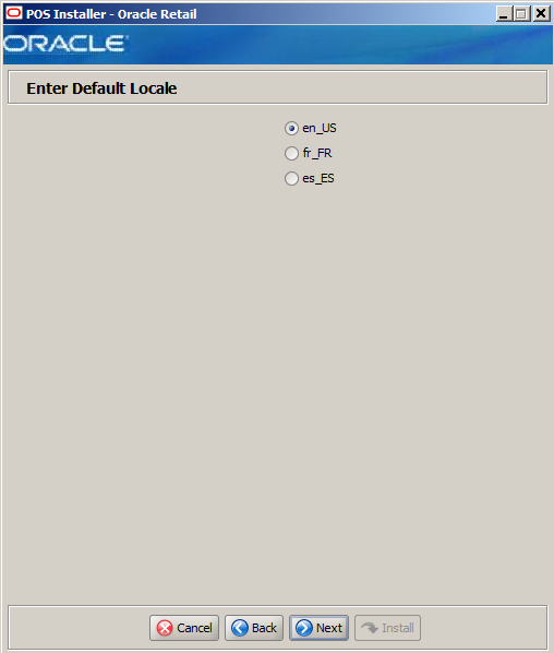 The choices for default locale are dependent on the selections made in the Supported Languages window. For each selected language, the default locale for that language is displayed in the Enter Default Locale window. For example, if English, French, and Italian are selected in the Supported Languages window, en_US, fr_FR, and it_IT are the available choices for the default locale. |