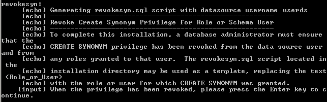 If this is a server install, after the installation is successfully completed, the CREATE SYNONYM privilege must be revoked. In the installer console window, it prompts for a database administrator to run the revokesyn SQL script to revoke the privilege. The script is found in the <INSTALL_DIR> directory.