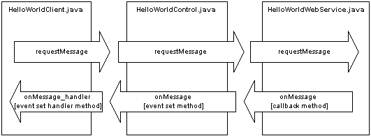 The client (on the far left) begins the interaction by requesting a message, a request that is passed on to the web service through the web service control.