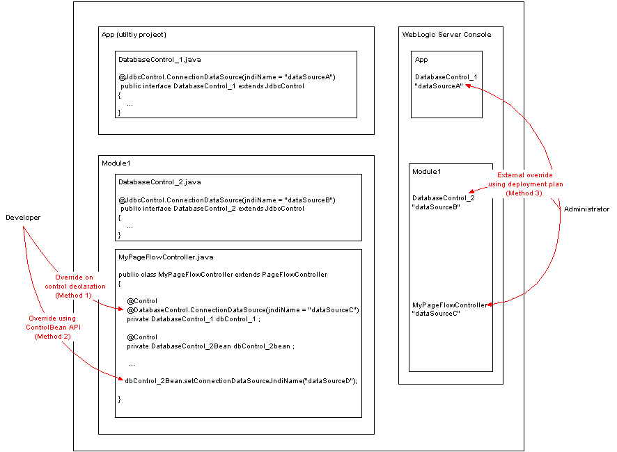 Option (3) is for use by server administrators who are managing the deployment of an application into a different environment. For example, if an application is being promoted from a testing environment into a real world production environment. A deployment plan can override annotation values on any of the control contexts in the application, including either the control definition or the control declaration in client code. Note that deployment plans can only override contexts already established by annotations, they cannot add new contexts or override any value set through the ControlBean.