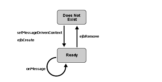 The EJB container is responsible for creating a pool of message-driven bean instances. When it creates an instance, it calls the setMessageDrivenContext() and the ejbCreate() methods. At this point the message-driven bean is ready to receive messages. When a bean instance is processing a JMS message, its onMessage method is being invoked. When the EJB container removes a bean instance, it first calls the ejbRemove method before the instance is ready for garbage collection. The life cycle of a message-driven bean is depicted in the following figure.
