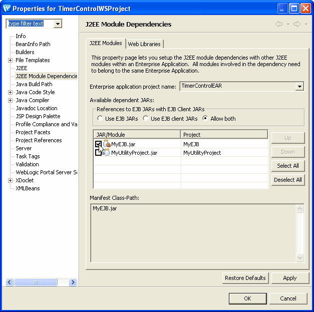 Note that the References to EJB JARs with EJB Client JARs box and the Use EJB JARs, Use EJB client JARs and Allow both buttons are not used by Workshop. Note also that EJB projects do not appear on the Web Libraries tab because EJBs are not libraries.