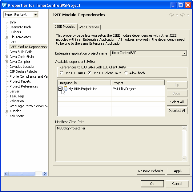The J2EE Module Dependencies option is the recommended option for creating project dependencies in Workshop. Do not use the Java Build Path option to set project dependencies because it does not create all dependencies correctly.
